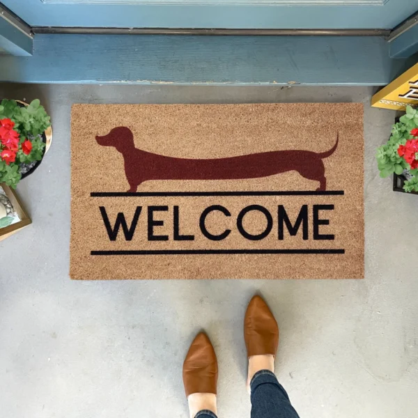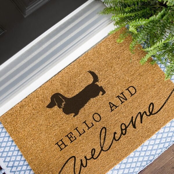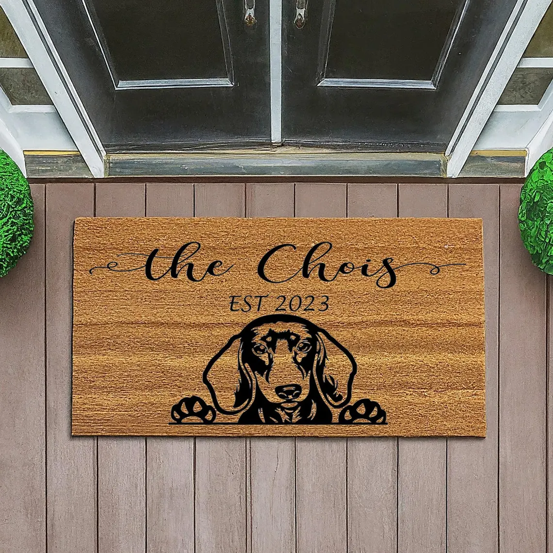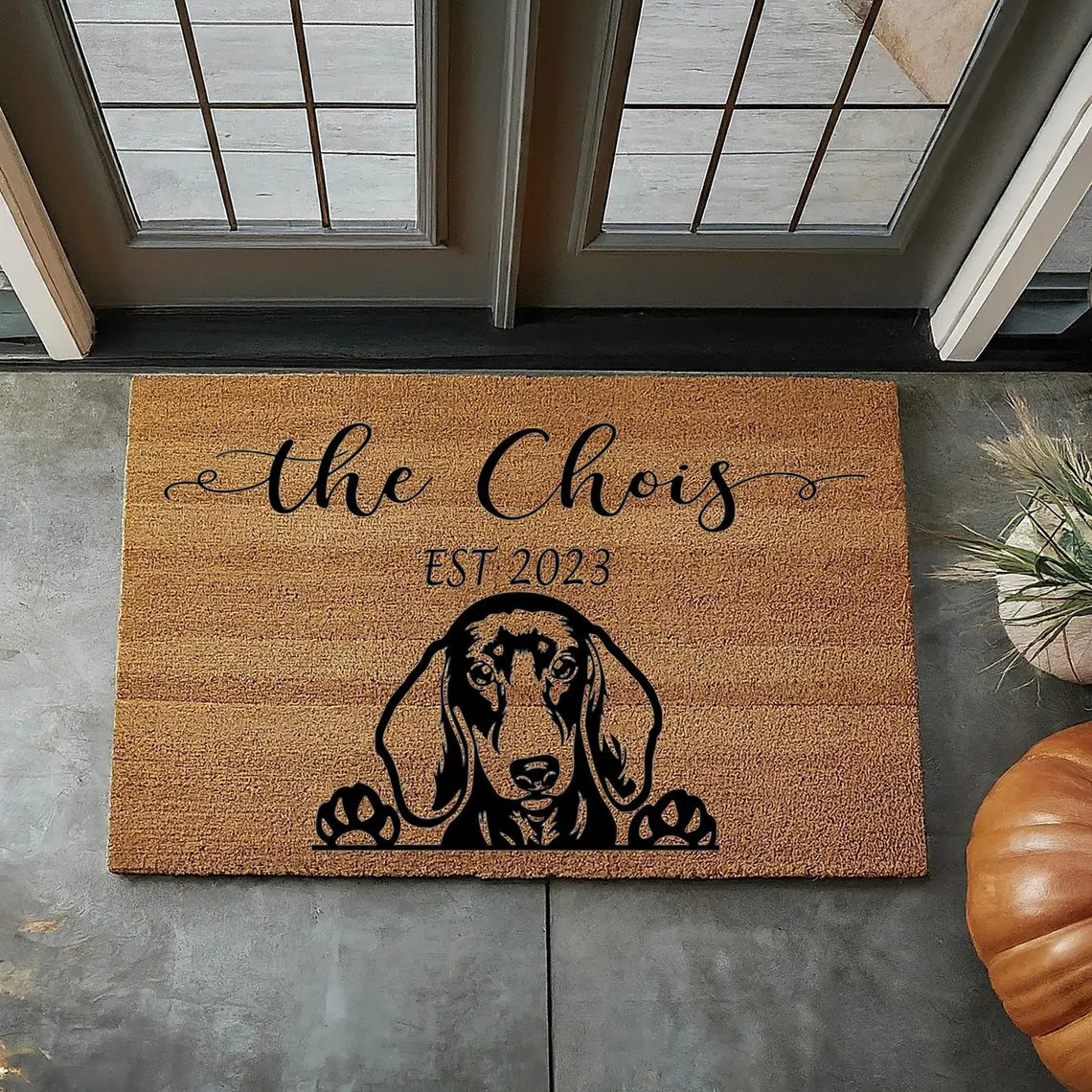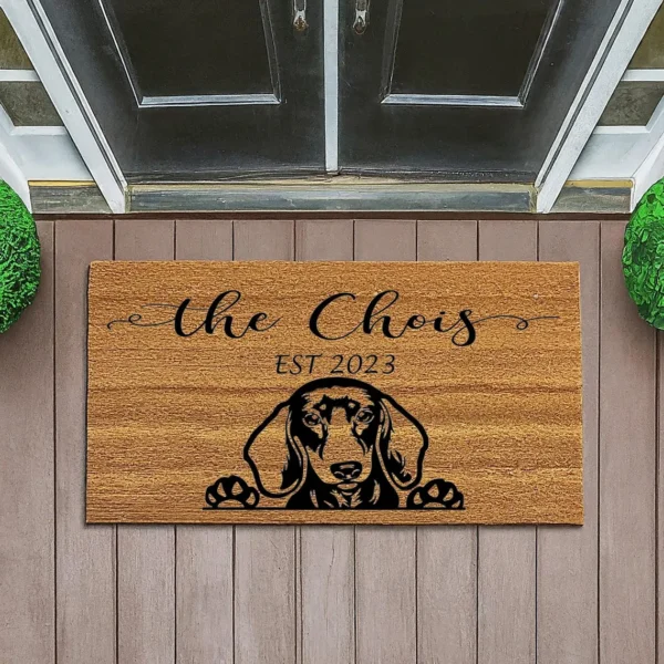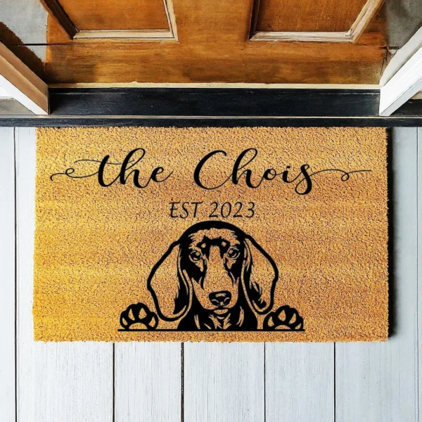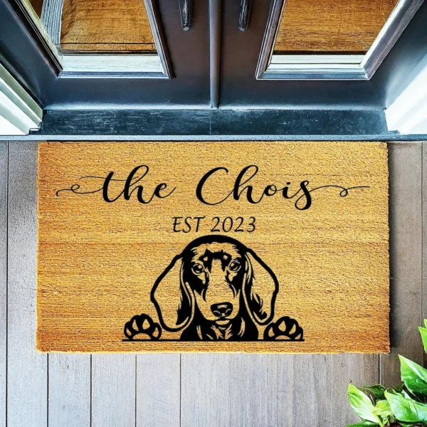 Welcome guests in style with this personalized doormat featuring a cute Dachshund dog design. Customizable with your family name and EST year, this durable coir welcome mat is perfect for front doors, patios, or entryways. Ideal as a housewarming gift, pet lover gift, or home décor accent. Non-slip backing ensures safety and long-lasting use.